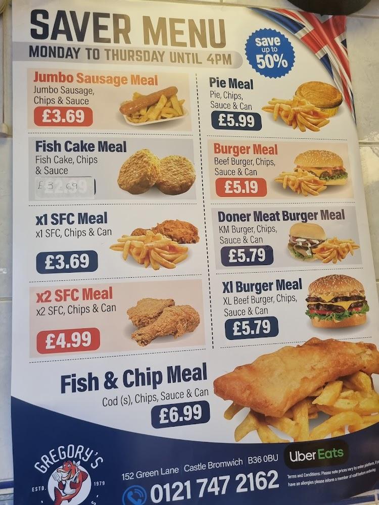 Gregorys Fish & Chip Shop lies on Green Lane, easily accessible for both locals and visitors in Castle Bromwich. This family-run business has been a staple of the community for more than four decades, cherished for its dedication to quality and service. The shop features a casual vibe, welcoming families, groups, and anyone craving delicious comfort food. Parking is convenient, and a wheelchair-accessible setup ensures that everyone can enjoy a meal here. The establishment thrives during dinner time, especially on Fridays when it hits full capacity, reflecting its popularity. The staff, known for their friendly demeanor, contribute to an inviting atmosphere that makes dining here feel warm and enjoyable. With options for takeaway and delivery, Gregorys fits seamlessly into the busy lifestyles of its customers.